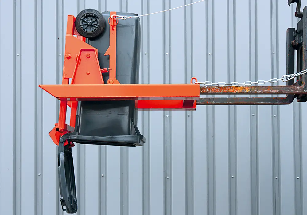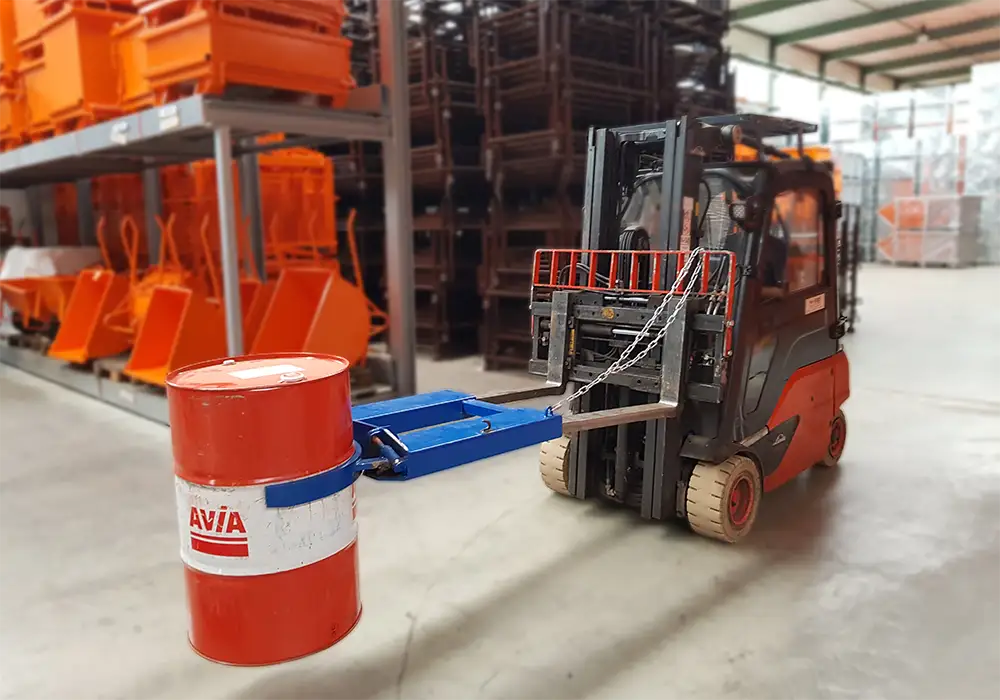Mit Stapler-Anbaugeräten und Behältern kann der Händler jedem Kunden mit Gabelstaplern zusätzliche Produkte für Transport, Sammeln, Kippen und Fasshandling anbieten.
